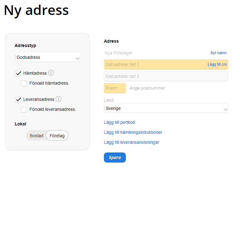 Våra smarta adresser har nu fullt stöd för alla världens adresser med postnummeruppslag, c/o-adresser, portkoder, alternativa avsändarnamn, förvald upphämtning/leverans och möjlighet att spara anpassade fraktuppgifter direkt på era adresser. Ange unik upphämtnings- och leveransinformation kopplad till varje adress så blir det mindre strul både för dig och dina mottagare.