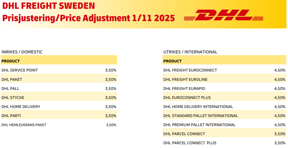 DHL Freight meddelar att nya priser börjar gälla den 1 november 2025. För inrikestransporter sker en justering på 3,50 %, medan de internationella tjänsterna Euroconnect och Euroline justeras med 4,50 %.